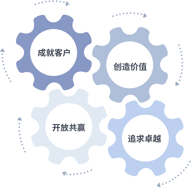 成就客户是一切决策的出发点,,,创造价值是衡量所有工作的标准,,追求卓越是我们做事做人的态度,,,开放共赢是我们的格局也是最终的结果。。。。价值观的齿轮环环相扣,,推动着组织里的每个人不断向前。。。